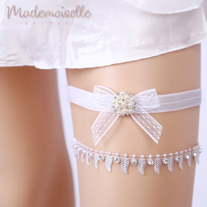 • A set of two white wedding garter, featuring a bow with pearl details in the centre on the main garter, rhinestones and petite leaves on the second garter. A beautiful garter set for the modern and chic brides.