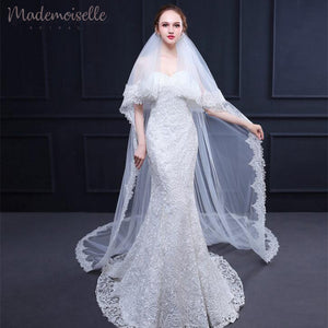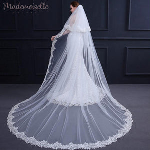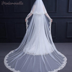 The Delphia Veil is a two-tier cathedral length veil with blusher. This gorgeous veil boasts a long three metres train and a blusher, both decorated with hand-sewn french lace applique. A dreamy and romantic veil for an extravagant wedding.