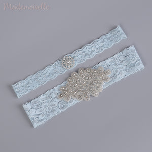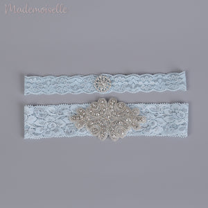 • This is a set of two french lace and rhinestones wedding garters in soft blue colour. The thinner garter is made with soft french lace with a rhinestone charm, and the thicker one is made with lace and a statement french applique decorated with rhinestones and glass beads.