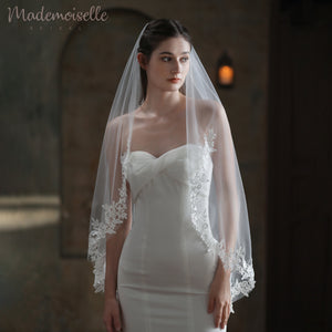 • Add a touch of delicate elegance to your wedding day with the Elodie Veil. This single-tier veil is made from soft, high-quality tulle and features a beautifully intricate lace appliqué edge, providing a refined and timeless look. This design complements a wide variety of bridal gowns, while the lightweight fabric ensures comfort throughout your special day.