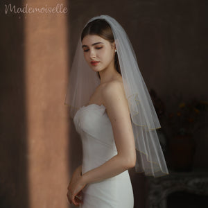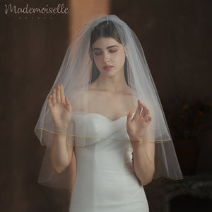 • This elegant, two-tier veil is crafted from premium tulle, offering a soft, lightweight feel. Its unique design features a shimmering golden thread edge that adds a sophisticated touch to your bridal look.